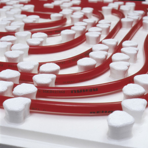6. Taierea placii REHAU cu nuturi vario (sau VarioNova) si aplicarea acesteia de-a lungul benzii perimetrale REHAU (- La amplasarea unei placi cu nuturi in continuarea celeilate se va avea in vedere continuitatea modelului, pentru a se respecta distanta de pozare dintre tevi.)