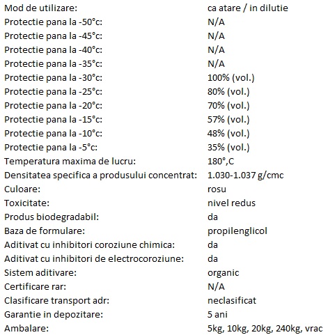 Raporturi de dilutie recomandate (vol.antigel:vol.apa)*: – ca atare, ofera protectie la -28°C – dilutie 3:1, ofera protectie la -23°C – dilutie 3:2, ofera protectie la -16°C – dilutie 1:1, ofera protectie la -11°C – dilutie 1:2, ofera protectie la -8°C